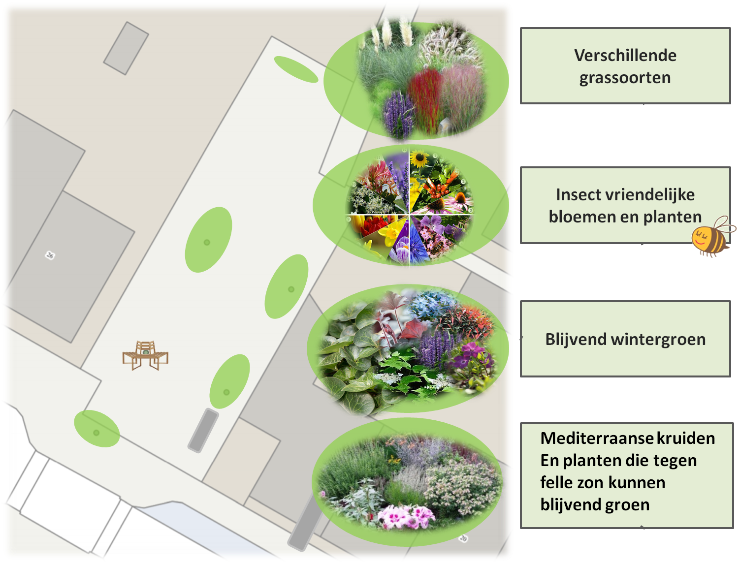 • Gebruik van planten passend bij huidige gemeente vereisten, hitte en droogtebestendig