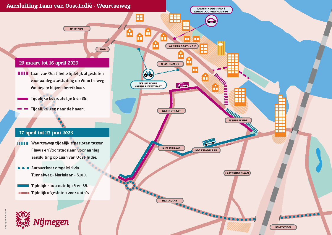 We starten met aanpassingen aan de Laan van Oost-Indië en de Weurtseweg. Vanaf 20 maart verandert de verkeerssituatie. De Weurtseweg zal voor langere tijd afgesloten zijn voor het doorgaande verkeer en dus ook voor het openbaar vervoer. Uiteindelijk zal bijna heel de Weurtseweg veranderen in een fietsstraat en wordt de Laan van Oost-Indië de doorgaande weg. Op 9 maart was er een inloopavond voor meer informatie.