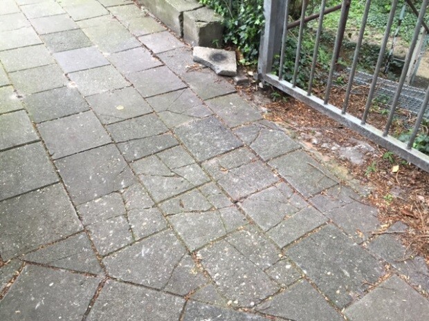 De trottoirtegels worden door boomwortels opgedrukt. De wortelopdruk wordt verholpen, onkruid verwijderd en het trottoir wordt opnieuw bestraat.