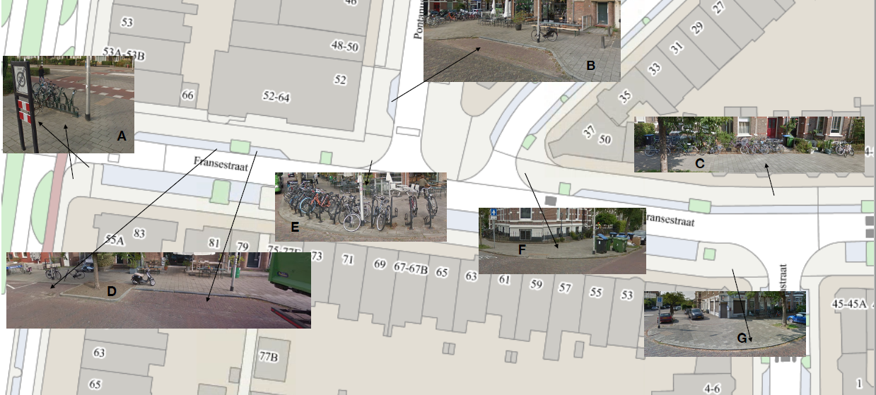 F. Hier zullen 10 fietsenrekken worden geplaatst tussen de trottoiroprit en de boomspiegel, waarbij rekening wordt gehouden dat er voldoende ruimte blijft voor een containeropstelplek.