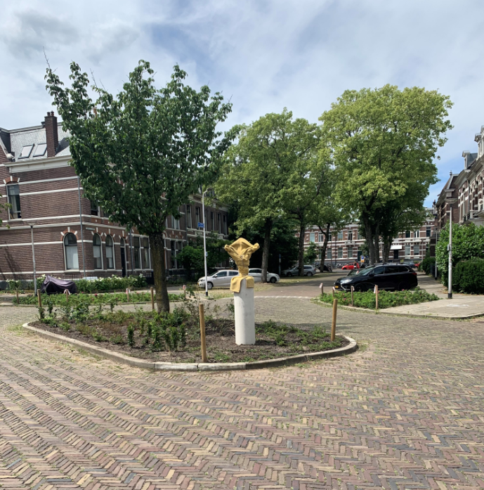 Wat wonen we in een leuke buurt. Toch ziet het er wat onderkomen en verloederd uit: veel zwerfafval, talloze fietsen overal en dan dat treurige en kale plantsoen op de kruising Pontanus- Van Slichtenhorststraat. Hoe zou het zijn als dat een echte make-over krijgt. Veel struiken, een bijenhotel, een kunstwerk of object?