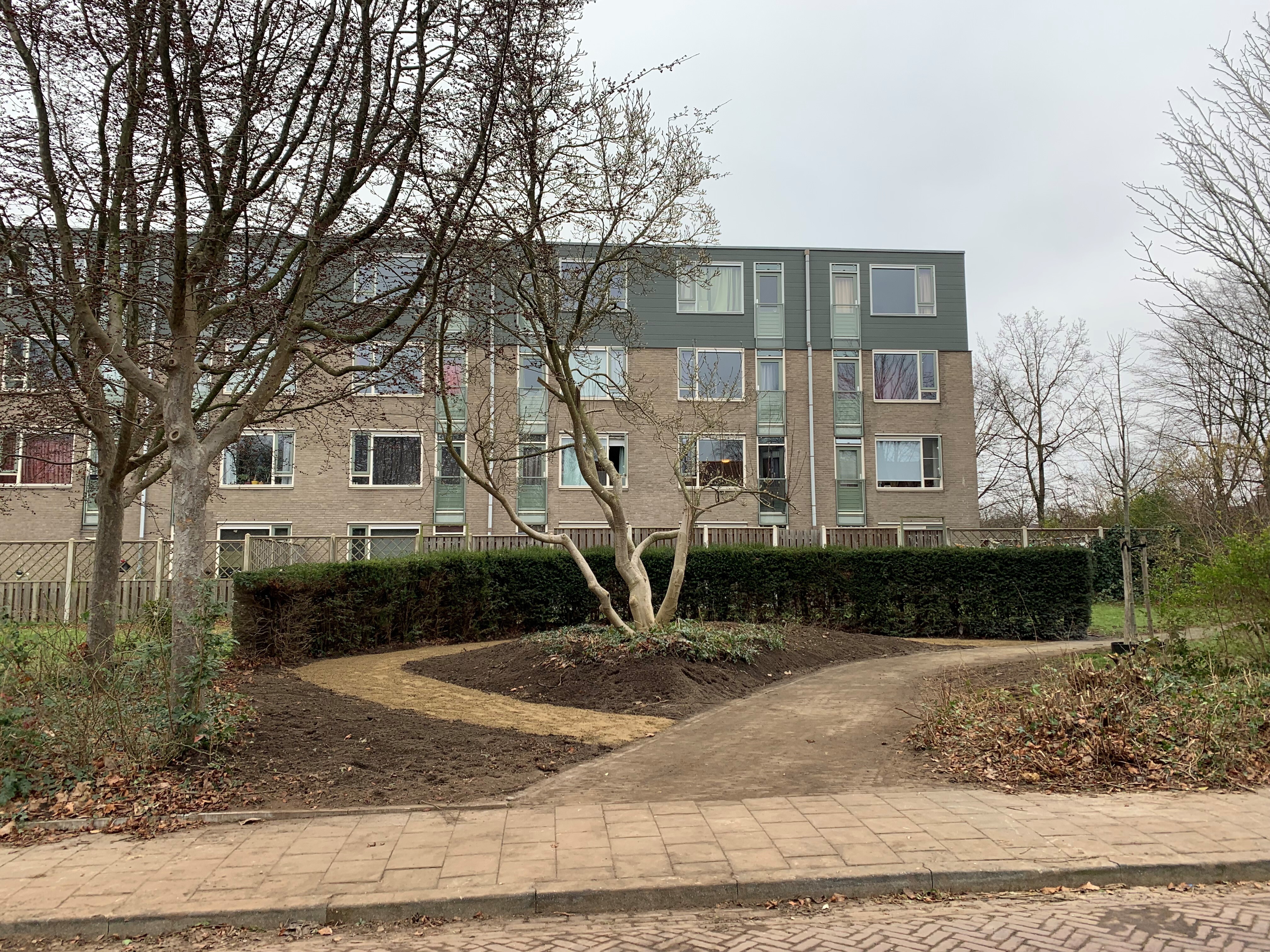 De banken en de prullenbakken zijn verwijderd waardoor er geen zitgelegenheid, en dus geen hangplek, meer is. Een deel van de bestrating is vervangen door halfverharding. De extra ruimte die ontstaat wordt ingevuld met meer groen.