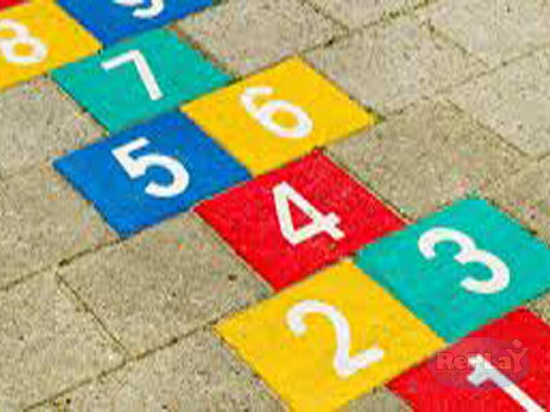 Een vast hinkelpad door stoeptegels te vervangen door gekleurde en genummerde tegels.