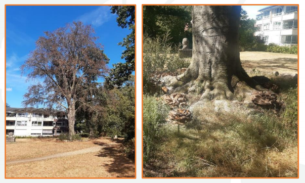 In het Augustijnenbos wordt binnenkort de monumentale rode beuk voor het appartementencomplex gekapt. Deze boom is ernstig aangetast door de reuzenzwam. In een ver gevorderd stadium, zoals bij deze rode beuk, wordt het wortelstelsel afgebroken waardoor de boom gemakkelijk kan omvallen. De boom wordt daardoor gevaarlijk voor de omgeving. Aantastingen door zwammen zijn helaas nooit te genezen. In het najaar van 2021 wordt in overleg met de werkgroep Augustijnenbos een nieuwe boom aangeplant. De komende tijd worden er nog meer bomen in het Augustijnenbos gecontroleerd.