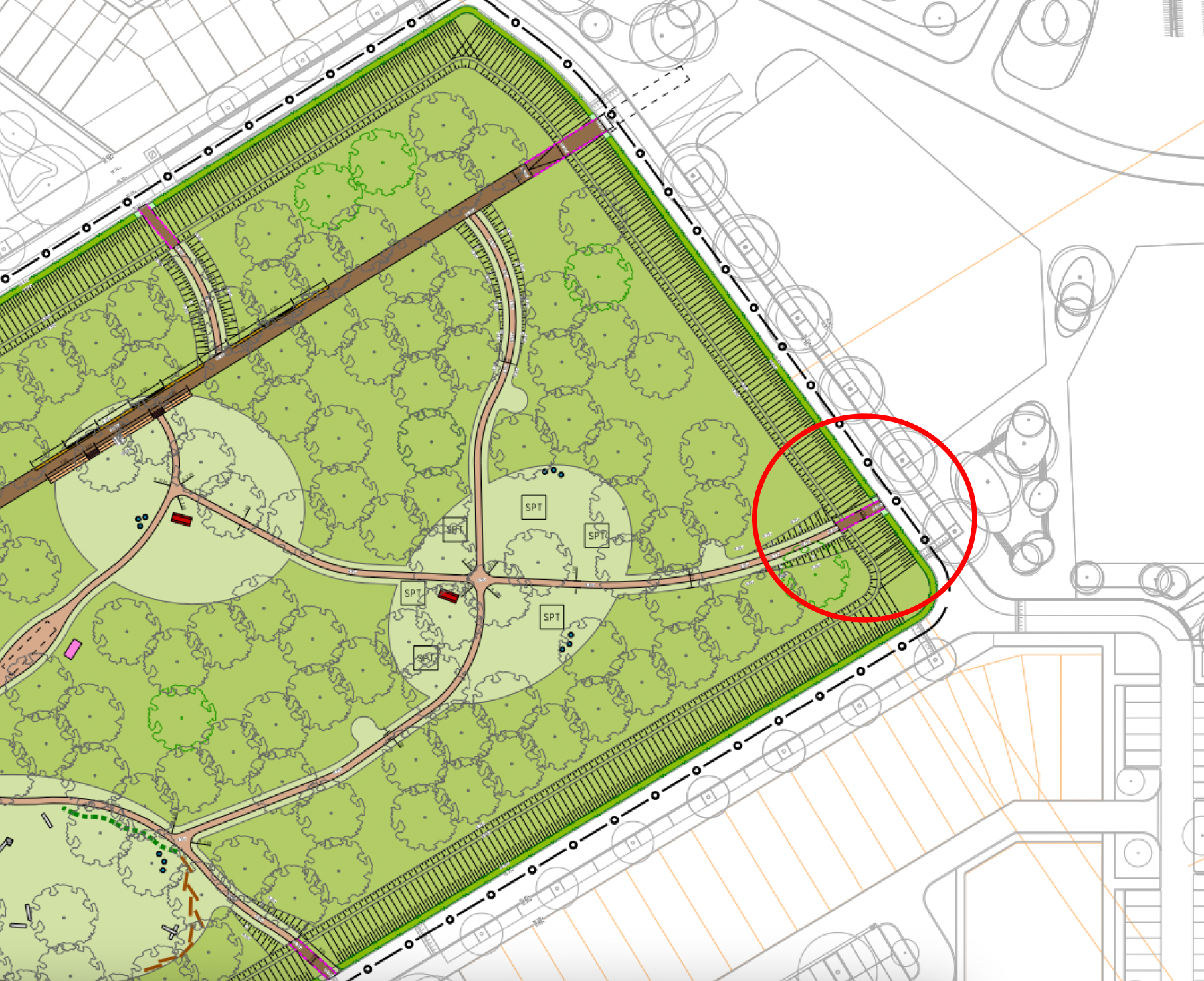 Om de veiligheid te waarborgen, sluiten we één uitgang van de boomgaard tijdelijk af (oostelijke ingang). Deze uitgang komt direct uit op de weg, wat onveilige situaties kan opleveren, met name voor spelende kinderen. In de toekomstige situatie wordt dit anders ingericht.