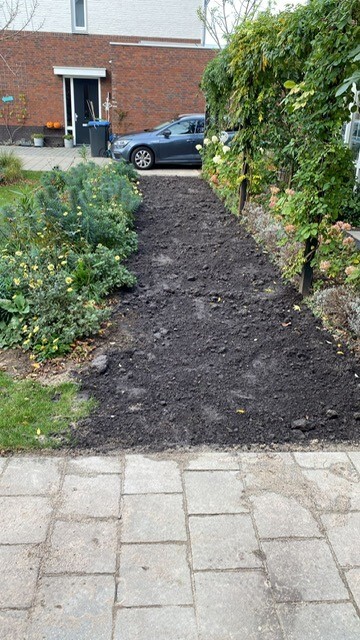 Bewoners hebben voor hun woning van een onbeplante groenstrook een mooie creatie gemaakt. Het voetpad heeft ook plaats gemaakt voor groen. De planten worden nog geplant door de bewoners.