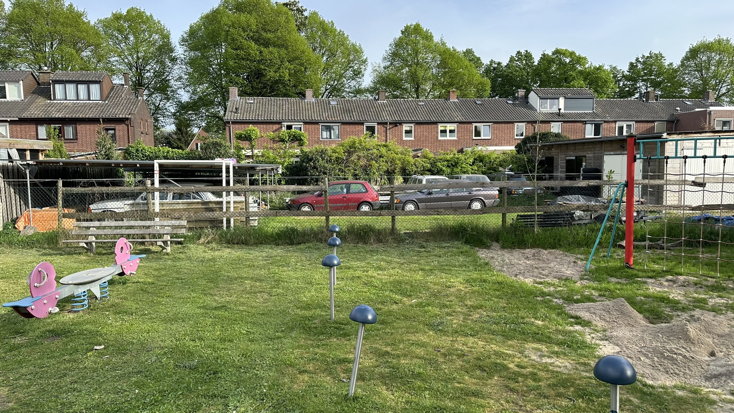 • Nu kijk je vanuit de speeltuin op een aantal oude auto's die op een aangrenzend terrein staan om opgeknapt te worden. Door middel van een haagje zou de speeltuin een veel aantrekkelijkere plek worden.