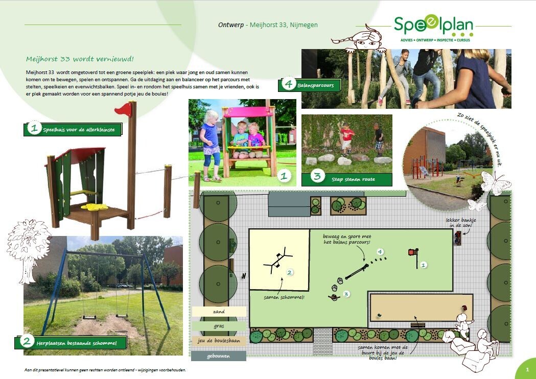 Vijf speelplekken in de Meijhorst worden bnnenkort aangepakt. In de bijlage kunt u de ontwerpen hiervan bekijken. De werkzaamheden starten: