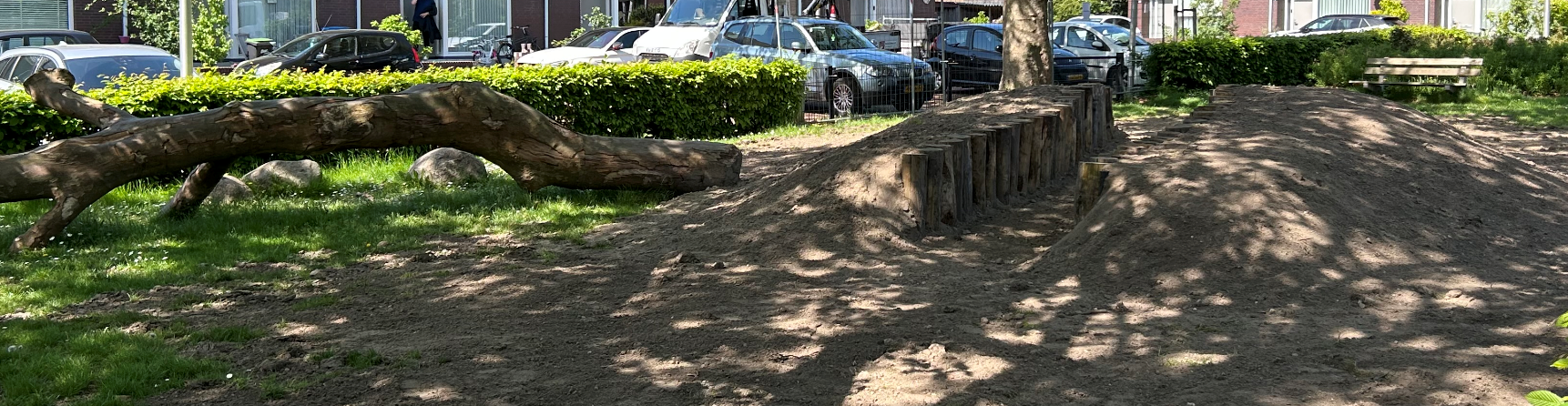 Vorige week is deze bult zand gevormd tot een heuvel met in het midden een pad. Aan de zijkanten van het pad staan stappalen. We hebben het speelveld tijdelijk afgezet met hekken, zodat het gras dat we hebben ingezaaid goed kan groeien. Eind mei zullen de hekken worden weggehaald en zullen er houtsnippers komen op het pad.