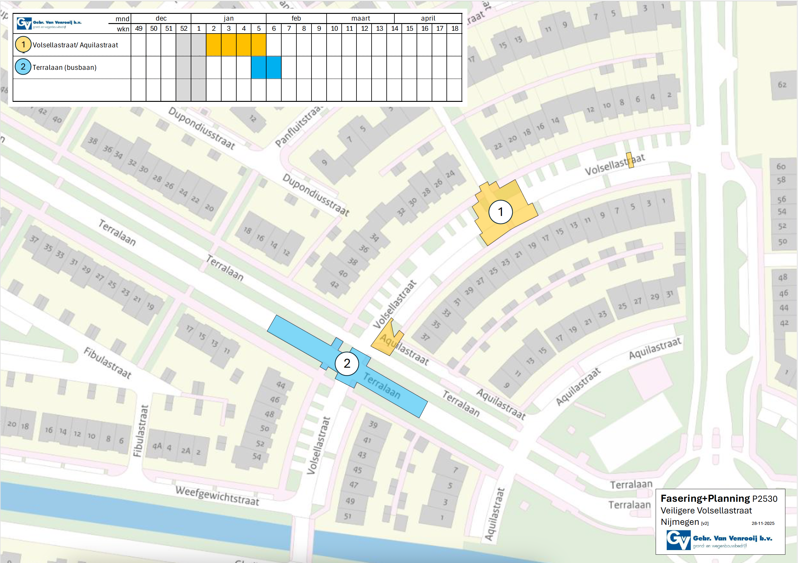 Voor de werkzaamheden aan de Volsellastraat en de Aquilastraat (fase 1) en de busbaan Terralaan (fase 2) gaan we nu uit van de volgende planning: