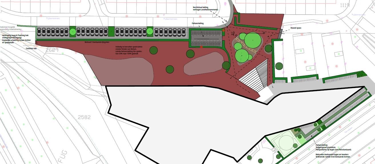 Het totaal aantal fietsenstallingen blijft gelijk, maar de locaties kunnen veranderen. Daarbij wordt zoveel mogelijk groen toegevoegd: extra hagen, groenvakken en bomen. De nieuwe indeling zorgt voor een veiliger, groener en prettiger plein voor kinderen en omwonenden.