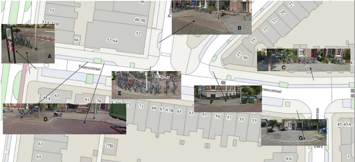 F. Hier zullen 10 fietsenrekken worden geplaatst tussen de trottoiroprit en de boomspiegel, waarbij rekening wordt gehouden dat er voldoende ruimte blijft voor een container-opstelplek.
