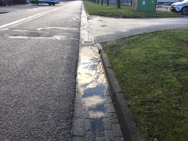 De goot is verzakt. Dit geeft problemen bij het verlaten van de in-/oprit. Ook blijft er veel water in de goot staan. De goot wordt opnieuw bestraat.
