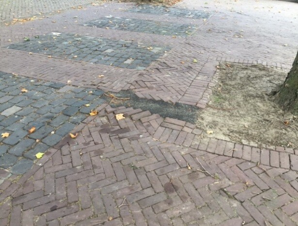 Door wortelopdruk komen de klinkers van de parkeerhaven omhoog. De wortelopdruk wordt verholpen en er wordt opnieuw bestraat.