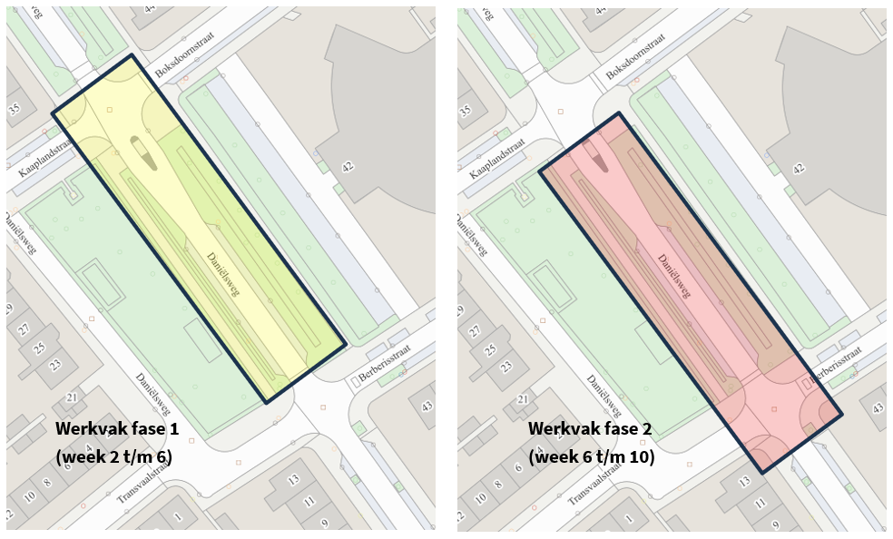 - Fase 2 - week 6 t/m week 10 2026: kruising Daniëlsweg/Berberisstraat/Transvaalstraat gesloten.