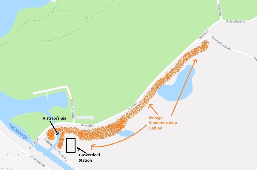 Waarom niet de groenstrook naast de 'vistrap/sluis' en het (wandel)pad onderlangs de (Ooyse)dijk tot aan de Persingensestraat aanwijzen als losloopgebied ?
