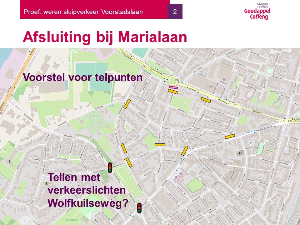 De proef met de afsluiting van de Voorstadslaan bij de rotonde op de Marialaan duurt twee weken. Tijdens de proef wordt de hoeveelheid verkeer gemeten op een aantal punten. Deze telpunten zijn op de kaart aangegeven met gele balkjes.