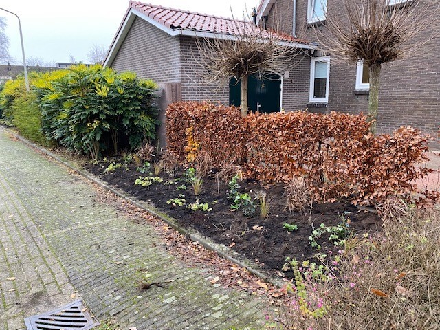 Bewoners onderhouden gezamenlijk groenstroken grenzend aan voortuinen om het eenduidige straatbeeld te behouden.