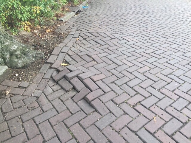 De klinkers worden door boomwortels opgedrukt. De wortelopdruk wordt verholpen en er wordt opnieuw bestraat.