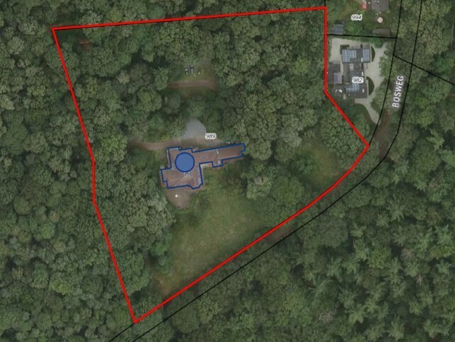 In die tekening is niet helder waar de twee woningen zijn gepland. waar het parkeer terrein komt, en hoe de paden/wegen gaan lopen vanaf de woningen en het parkeerterrein naar de Bosweg.