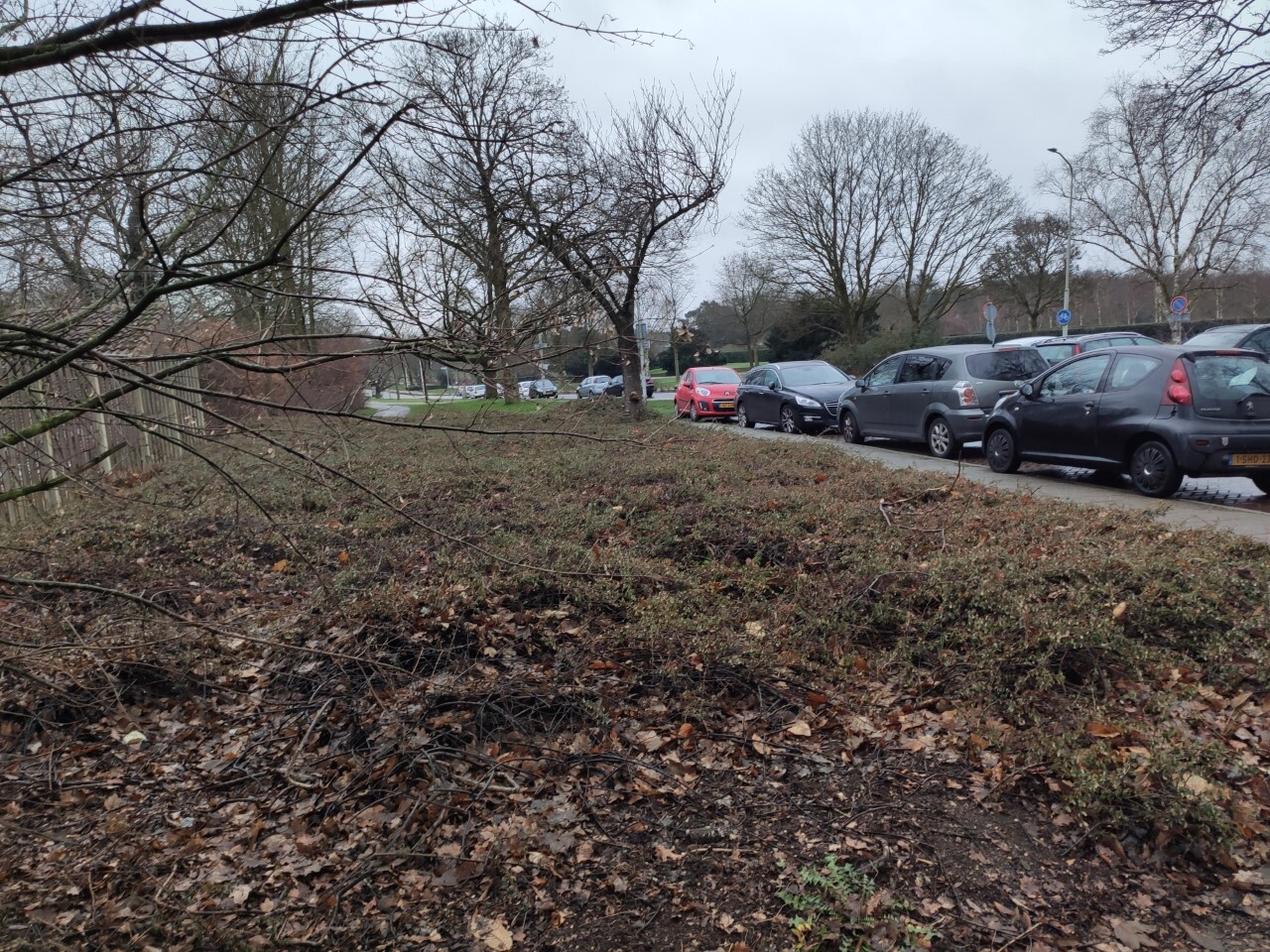 In de aftakking van de Slotemaker de Bruïneweg (richting het politiebureau) staan in de bocht op gezette tijden auto's geparkeerd. Dit levert een wegversmalling en soms gevaarlijke situatie op met auto's die elkaar moeten passeren (o.a. politieauto's met sirene). Naast de weg (links op de foto) is een verwilderd stuk groen, waar eenvoudig meerdere parkeerplaatsen gerealiseerd kunnen worden, gelijk aan verderop in de straat. Hierdoor staan de auto's netjes in een parkeervak en kan er niet meer op straat geparkeerd worden.