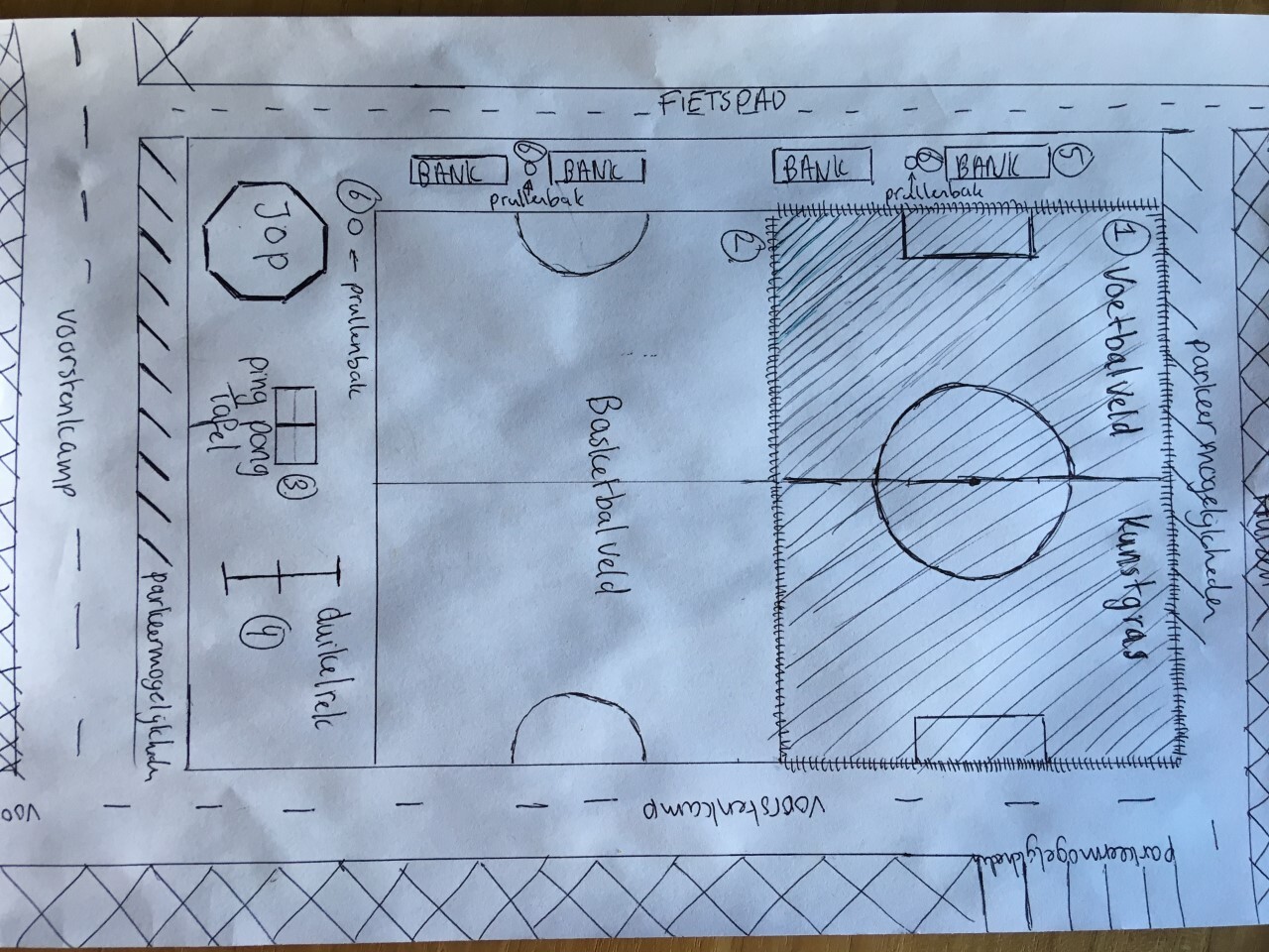 Dit is ons plan, ter ondersteuning hebben wij een tekening gemaakt van het voor ons ideale pleintje.