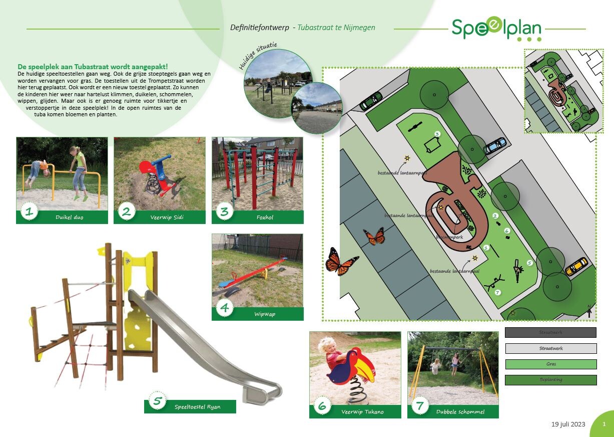 De speeltoestellen die er nu staan gaan weg. Ook de grijze stoeptegels worden vervangen voor gras. De toestellen uit de Trompetstraat worden hier terug geplaatst en er komt een nieuw toestel bij. Zo kunnen de kinderen weer naar hartelust klimmen, duikelen, schommelen, wippen, glijden, maar er is ook nog genoeg ruimte voor tikkertje en verstoppertje. In de open ruimte van de tuba komen bloemen en planten.