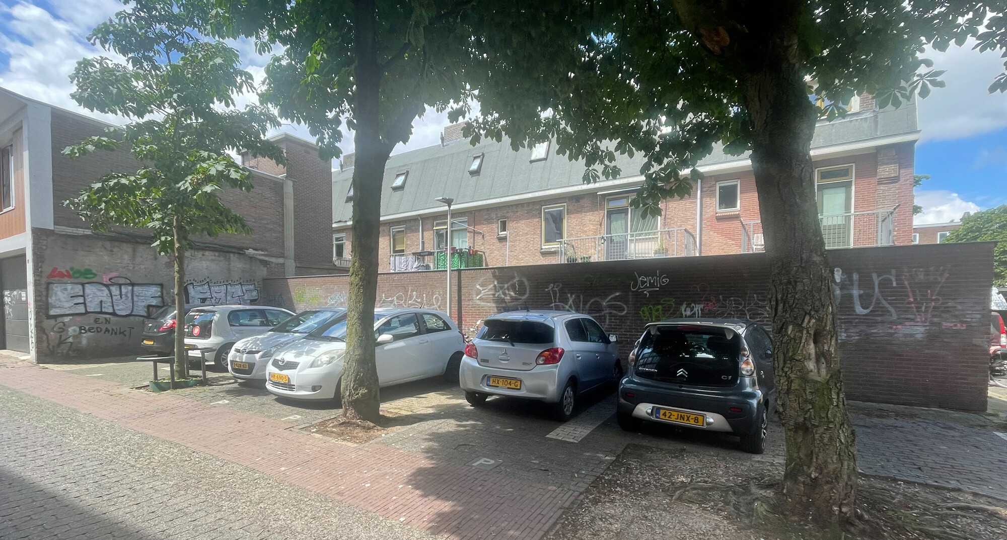 Street Art op de muren achter en aan de zijkant van een parkeervak.