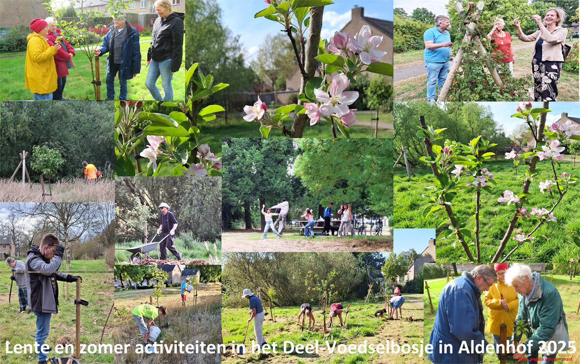 Biodiverse groene circel met daarin een aantal geschikte fruit en noten bomen en fruitstruiken. En een bankje. Gelegen aan de zuid-oostkant in het Vijverparkje in Aldenhof.