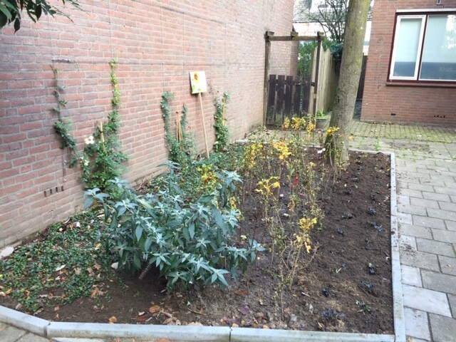 De tegels zijn eruit gehaald en er is nieuwe grond en beplanting aangebracht.