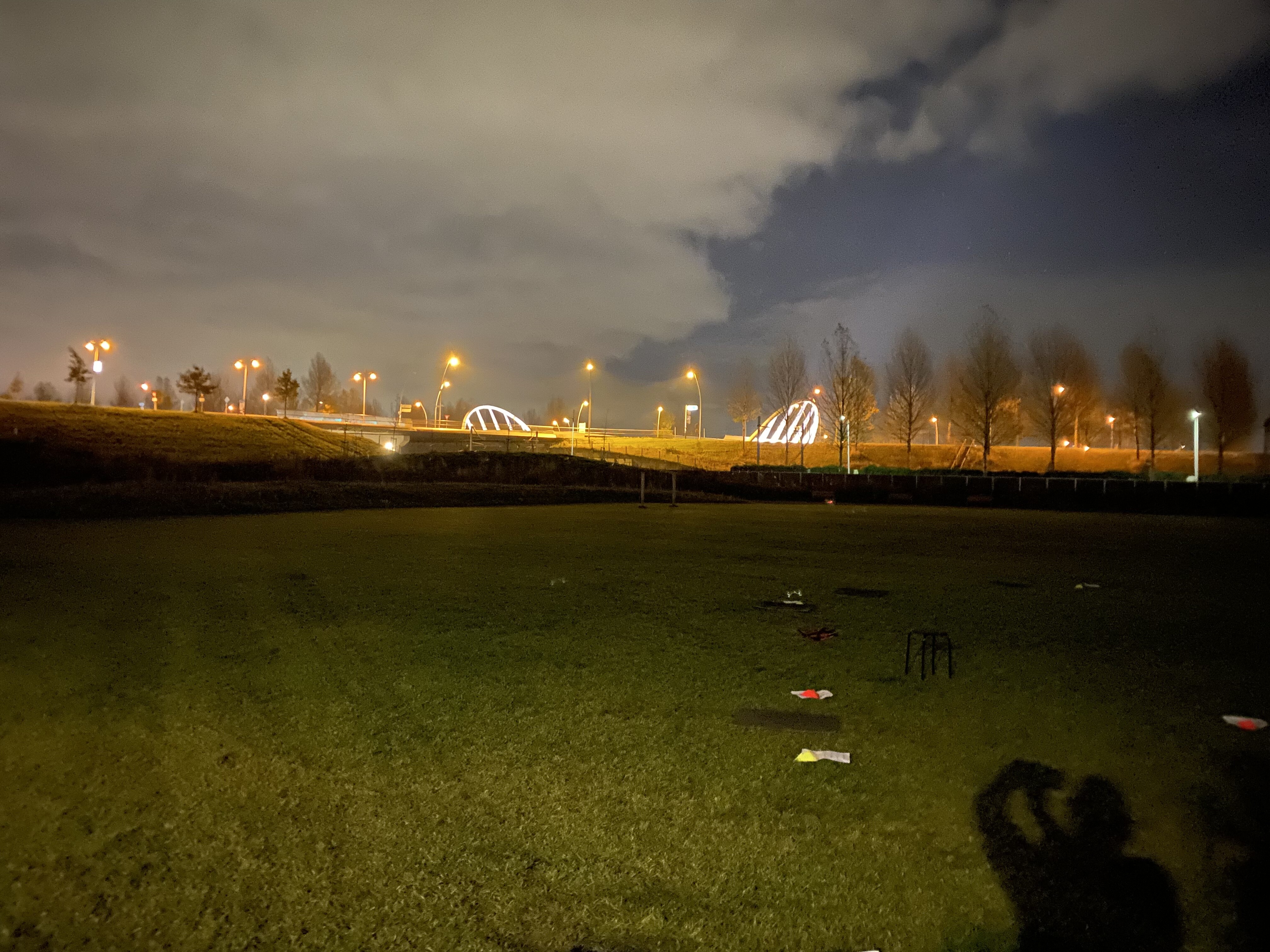 Zeker in deze tijd waar buiten sporten steeds belangrijker wordt is het fijn als we ook dit deel van het park kunnen gebruiken als het donker is. Tweede foto gemaakt met meer licht en langere sluitertijd, eerste foto is hoe donker het er echt is s avonds.