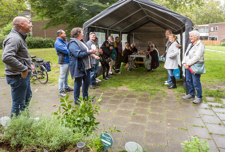 Planten van een walnotenboom aan de 40e straat in Tolhuis op de plek waar onlangs een zieke boom is gerooid. Deze boom kan een hele mooie volgende stap zijn op weg naar een wijk vol eetbaar groen. Voor dit plantsoen bestaan al langer ideeen om meer met eetbaar groen te doen. In deze straat is ook het project Herbies & More geboren, een idee om eetbaar groen vanuit je tuin te delen met je buren. Het project wordt ondersteund door WijkMakerij Dukenburg. De foto is door Jacqueline van den Boom gemaakt op burendag, toen de boom er nog stond (achter de tent). We kunnen het project combineren met meer eetbaar groen en een uitrolactie van Herbies & More.